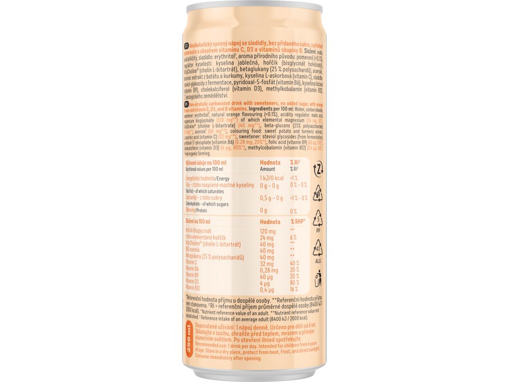 Compoziție: apă, dioxid de carbon, îndulcitor: eritritol*, aromă de origine naturală: portocală (<0,1%), regulator de aciditate: acid malic, magneziu (bisglicinat de magneziu), VitaCholine® (colină L-bitartrat), betaglucani (25% polizaharide), acerola*, colorant: extract de cartof dulce și turmeric, acid L-ascorbic (vitamina C), îndulcitor: glicozi de steviol din fermentație, piridoxal-5-fosfat (vitamina B6), acid folic (vitamina B9), colecalciferol (vitamina D3), metilcobalamină (vitamina B12).