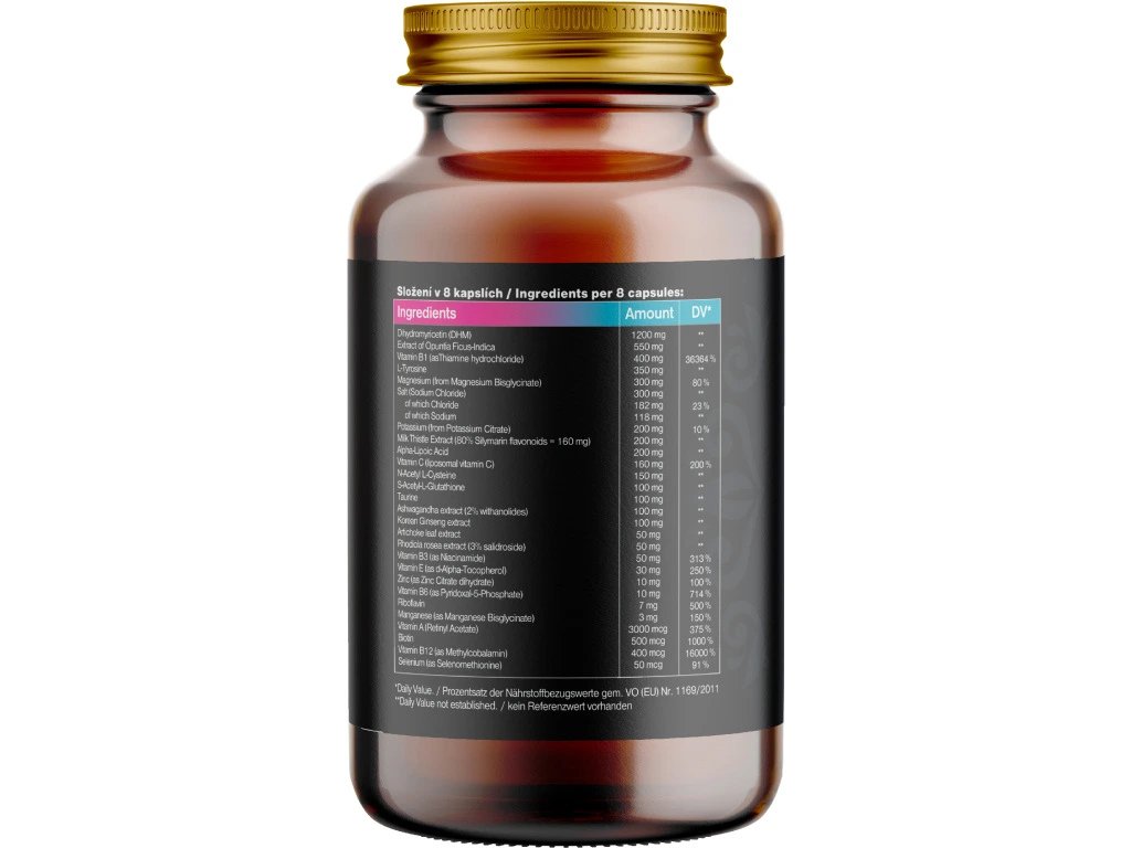 Compoziţie: Dihidromiricetină, extract de Opuntia ficus-indica, vitamina B1 (sub formă de clorhidrat de tiamină), L-tirozină, magneziu (din bisglicinat de magneziu), sare (clorură de sodiu), din care clorură, din care sodiu, potasiu (din citrat de potasiu), extract de ciulin de lapte (standardizat la 80% silimarină), acid alfa-lipoic, vitamina C-Steină, vitamina C-L-Steină l-L-glutation, taurină, extract de ashwaganda (2% withanolide), extract de ginseng coreean, extract de frunze de anghinare, extract de rododendron rosea, niacină (sub formă de niacinamidă), vitamina E (sub formă de d-alfa-tocoferol), zinc (sub formă de citrat de zinc dihidrat), vitamina B6 (piridoxal, mangan glicetat de mangan-5-flavin), vitamina A (piridoxal-5-flavină)), biotină (500 mcg, RHP 1000%), vitamina B12 (sub formă de metilcobalamină), seleniu (sub formă de selenometionină). Capsulă vegetală pe bază de HPMC. Fara substante de balast.
