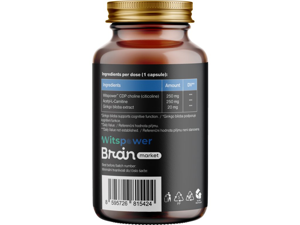 Ingrediente per porție (1 capsulă): CDP colină (citicolină) sub formă de Witspower™ (250 mg, VNR **), Acetil-L-Carnitină HCL (250 mg, VNR **), extract de Ginkgo biloba 4:1 (din frunze) (20 mg, VNR **). Capsulă vegetală pe bază de HPMC. Nu conține substanțe de balast (numere E).