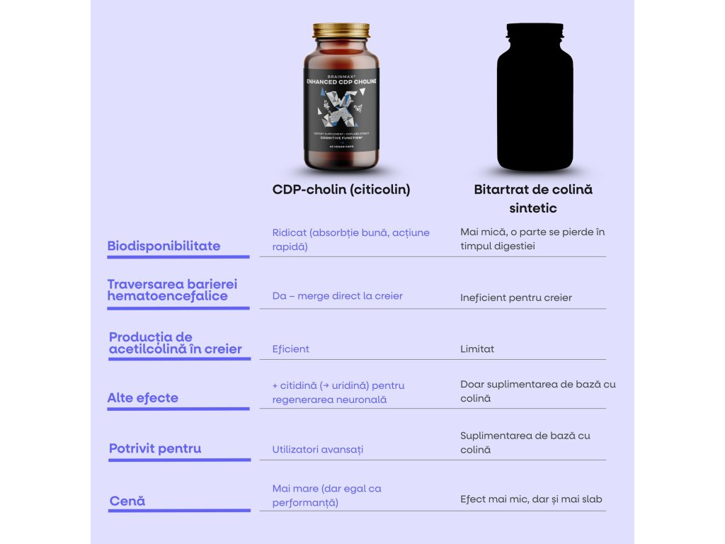 Colina CDP este una dintre formele cele mai absorbabile și, spre deosebire de forma obișnuită de colină (bitartrat de colină sintetic), traversează foarte bine bariera hematoencefalică. Cea mai bună pentru cei mai exigenți utilizatori.