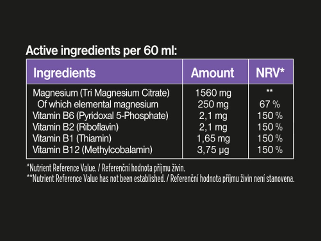 Compoziție pentru 60 ml: apă, citrat de magneziu (1560 mg, VNR**), din care magneziu elementar (250 mg, VNR* 67 %), regulatori de aciditate (acid malic, acid citric), arome, conservant (sorbat de potasiu), stabilizator (gumă xantan), îndulcitor (steviol-glicozide din stevie), vitamina B6 (piridoxal-5-fosfat) (2,1 mg, VNR* 150 %), vitamina B2 (riboflavină) (2,1 mg, VNR* 150 %), vitamina B1 (tiamină) (1,65 mg, VNR* 150 %), vitamina B12 (metilcobalamină) (3,75 µg, VNR* 150 %).