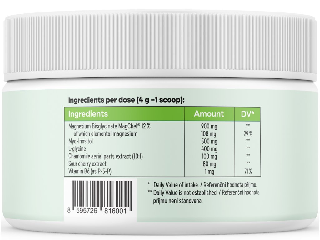 Ingrediente: MagChel® bisglicinat de magneziu (900 mg, VNR **), din care magneziu elementar (108 mg, VNR 29%), stabilizator: acid citric, mio-inozitol (500 mg, VNR **), L-glicină (400 mg, VNR **), pudră de piersici liofilizată, aromă naturală, inulină de agave, colorant: extract de șofrănaș, extract de mușețel (10:1) (100 mg, VNR **), extract de vișine acre (80 mg, VNR **), vitamina B6 sub formă de P-5-P (1 mg, VNR 71%).