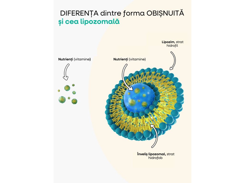 Lipozomii sunt compuși din fosfolipide naturale, care sunt elementele de bază ale tuturor celulelor noastre, de aceea trec prin pereții celulelor complet fără probleme, prin așa-numitul transport pasiv. În mod natural, lipozomii se găsesc, de exemplu, în colostru și laptele matern, unde absorbția și utilizarea maximă sunt absolut necesare. Datorită structurii lor, lipozomii protejează vitaminele de descompunerea în sistemul digestiv și permit transportul direct al acestora către celule. Acest mod de livrare crește biodisponibilitatea vitaminelor, ceea ce înseamnă că organismul obține mai mulți nutrienți din fiecare doză comparativ cu formele obișnuite de suplimente.