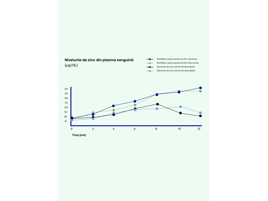 Studiul a arătat că zincul ascorbat din suplimentul nostru lipozomal are o biodisponibilitate de până la 3,8 ori mai mare decât formele obișnuite de zinc sub formă de pulbere. Datorită tehnologiei lipozomale, zincul se absoarbe mai eficient și poate menține un nivel stabil în sânge timp de până la 12 ore, în timp ce formele nelipozomale încep să scadă deja după câteva ore. Studiul a confirmat, de asemenea, că forma lipozomală a zincului este nu doar mai eficientă, ci și o cale mai de încredere pentru a furniza acest mineral esențial organismului.