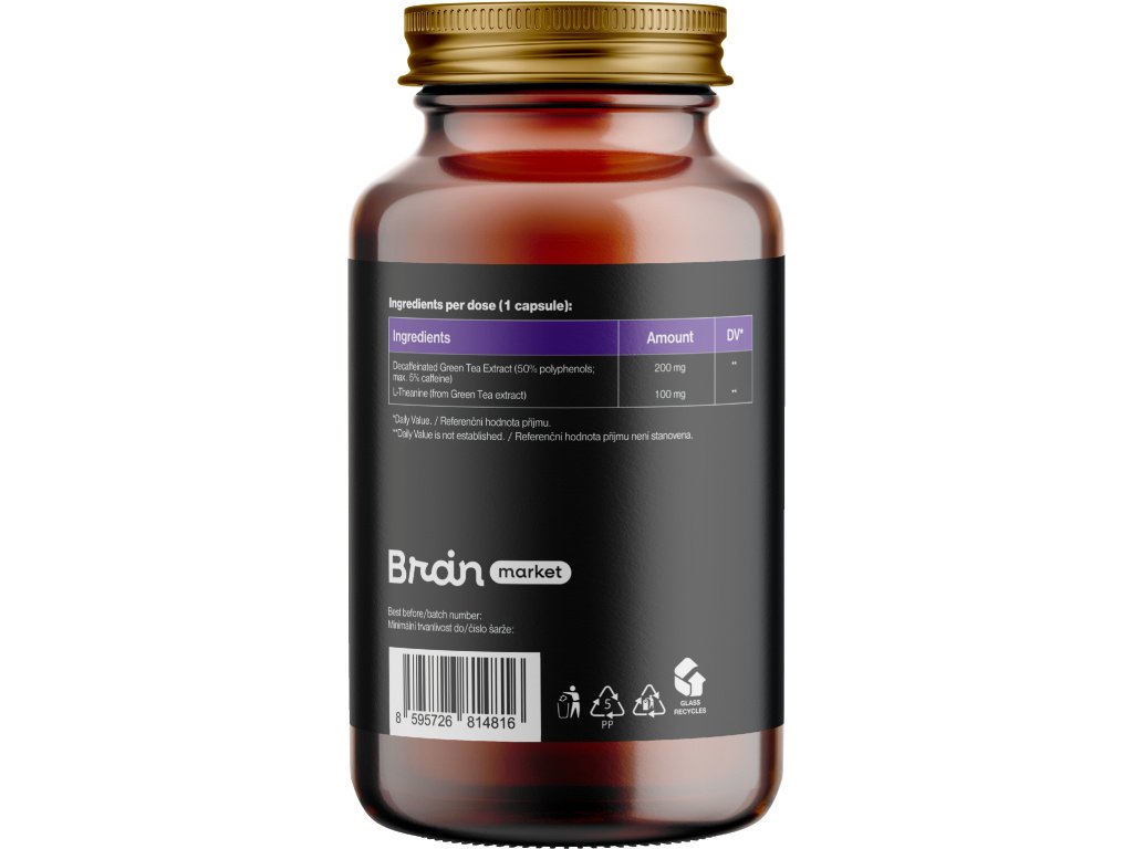 Compoziție: Extract de ceai verde fără cofeină (50% polifenoli; max. 5% cofeină) (200 mg, VNR **), L-Theanin (extract din frunze de ceai verde) (100 mg, VNR **). Capsulă vegetală pe bază de HPMC. Nu conține aditivi (E-uri).