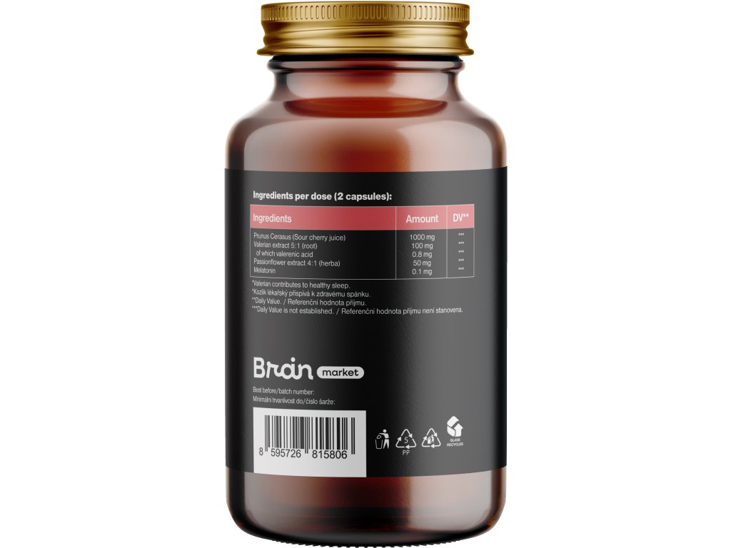 Ingrediente: Suc de vișine (1000 mg, VNR **), extract de rădăcină de valeriană 5:1 (100 mg, VNR **) - din care acid valerenic (0,8 mg, VNR **), extract de floarea pasiunii 4:1 (parte aeriană) (50 mg, VNR **), melatonină (0,1 mg, VNR **), maltodextrină, capsulă vegetală pe bază de HPMC.