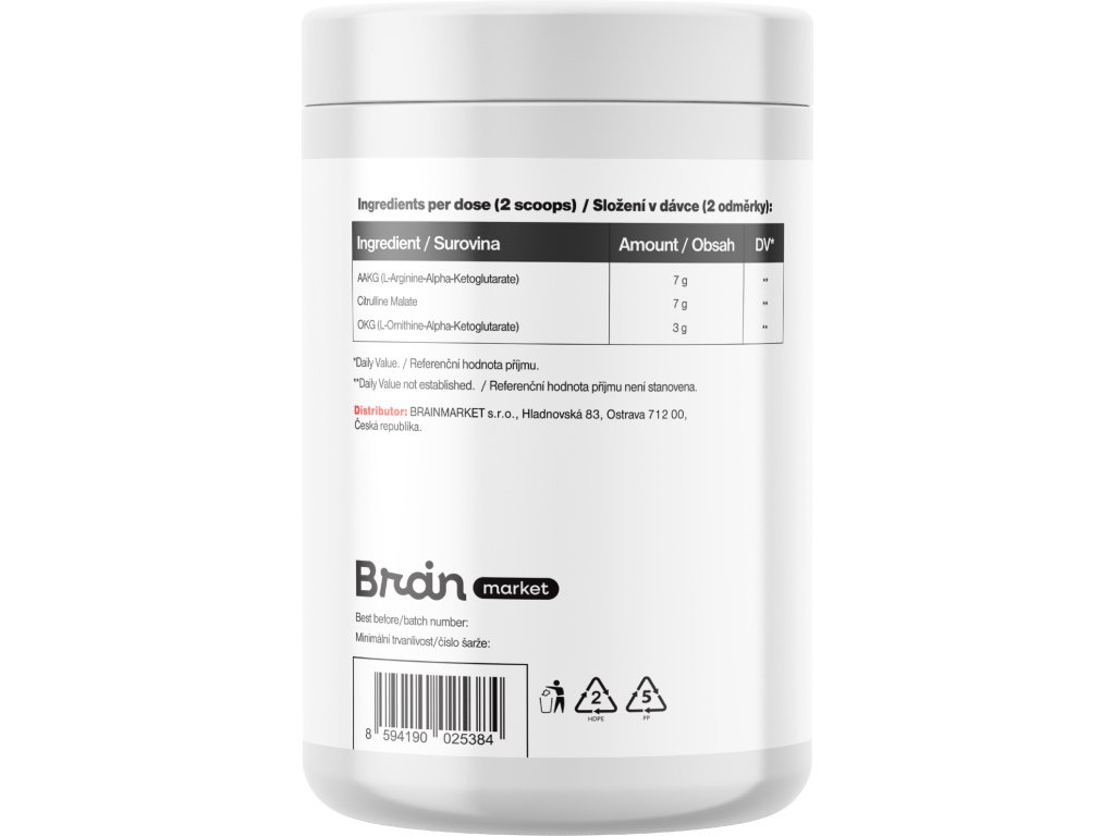 Compoziție: L-arginină sub formă de alfaketoglutarat, L-citrulină sub formă de malat, L-ornitină sub formă de alfaketoglutarat. Produsul nu conține substanțe balast, dar datorită naturii sale higroscopice poate deveni dur dacă nu este bine închis. Acest lucru nu afectează eficacitatea. Este suficient să zdrobiți amestecul întărit, de exemplu, cu o lingură și puteți continua să îl utilizați fără probleme.