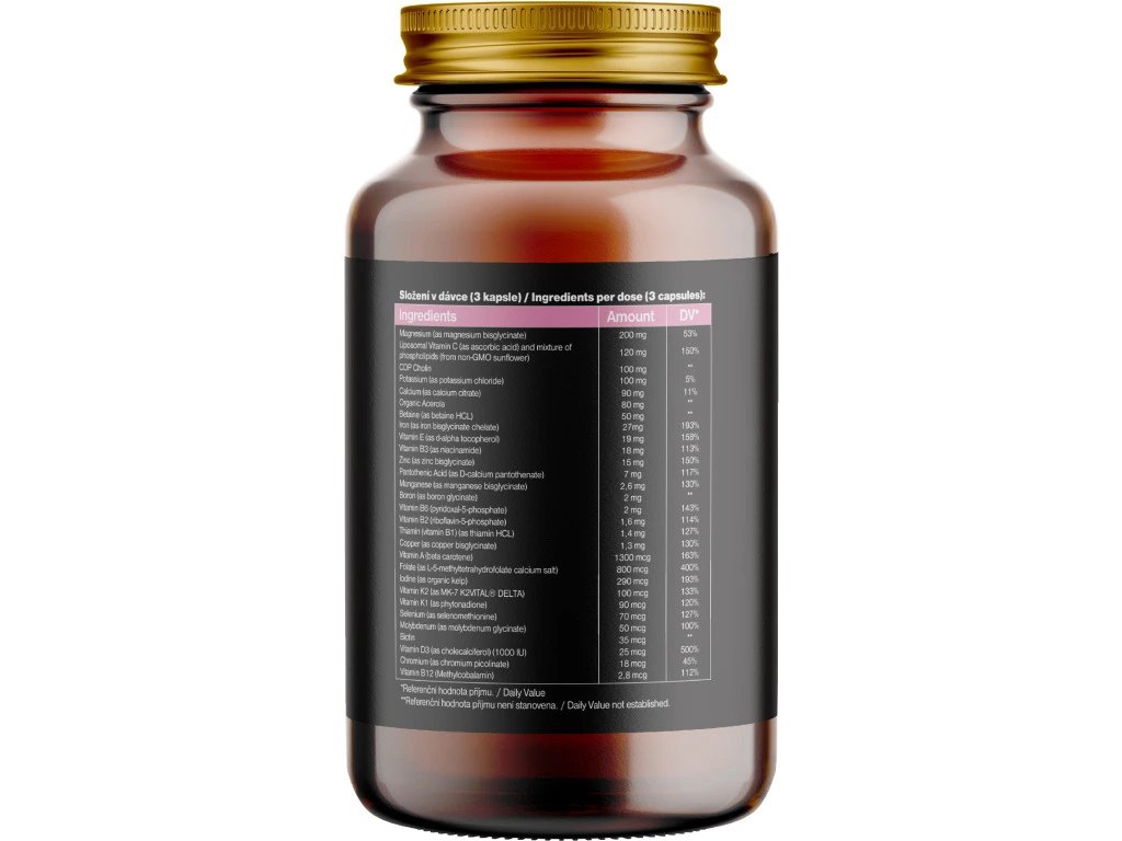 Ingrediente: Bisglicinat de magneziu, vitamina C lipozomală (acid ascorbic), colină CDP, potasiu (sub formă de clorură de potasiu), calciu (sub formă de citrat de calciu), acerola organică, betaină (sub formă de betaină HCI), fier (chelat de bisglicinat feros), vitamina E ( sub formă de d-alfa tocoferol), vitamina B3 (niacinamidă), vitamina B3 (niacinamidă), zinc (din bisglicinat de zinc), acid pantotenic (sub formă de D-pantotenat de calciu), mangan (bisglicinat de mangan), bor (sub formă de glicinat de bor), vitamina B6 (piridoxal-5-fosfat), vitamina B2 (riboflavin-5-fosfat), vitamina B1 (sub formă de tiamină HCI), cupru (sub formă de bisglicinat de cupru), vitamina A (beta-caroten), folat (sub formă de sare de calciu a L- 5-metiltetrahidrofolat), iod din alge BIO, vitamina K2 (sub formă de K2VITAL®DELTA MK7), vitamina K1 (sub formă de fitonadionă), seleniu (sub formă de selenometionină), molibden (glicinat de molibden), biotină, vitamina D3 (colecalciferol), crom (crom) picolinat), vitamina B12 (metilcobalamina)