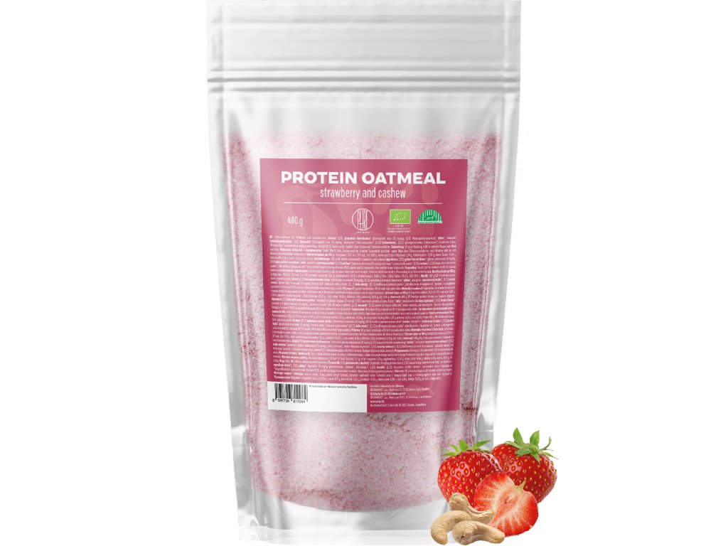 Compoziție: (27%) fulgi de ovăz fără gluten* (conținut de gluten max. 20 mg/kg), (25%) concentrat proteic din zer* (lapte*, emulgator: lecitină din floarea-soarelui*), (15%) făină de ovăz* (conținut de gluten max. 20 mg/kg), zahăr din trestie*, lapte pudră de cocos*, (6,3%) nuci caju*, (5,5%) pudră de căpșuni liofilizate*, aromă naturală, sare de Himalaya. *produs din agricultură ecologică. Conține 99,2% ingrediente ecologice. Poate conține urme de arahide.