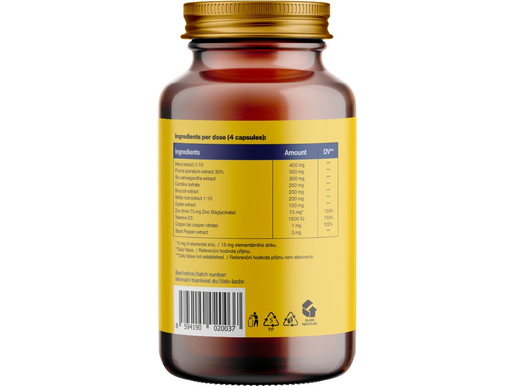 Testamento® conține ingrediente naturale atent selectate, precum ashwagandha și zinc, care împreună sprijină funcționarea normală a sistemului hormonal1. În plus, conține maca, care susține fertilitatea3, vitalitatea3 și sănătatea fizică și mentală3.