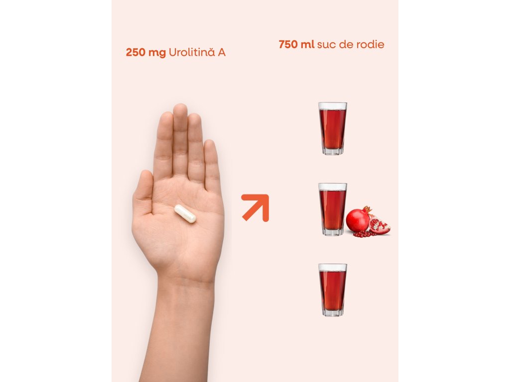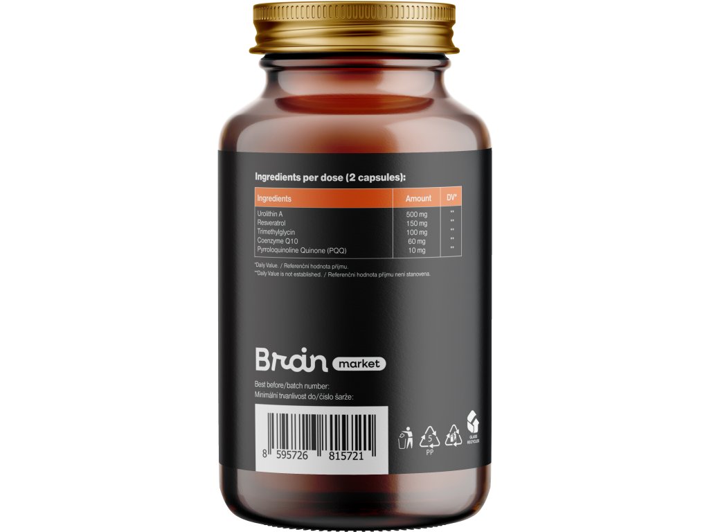 Ingrediente: Urolitină A (500 mg, VNR **), Resveratrol (150 mg, VNR **), Trimetilglicină (TMG) (100 mg, VNR **), Coenzima Q10 (60 mg, VNR **), Pirolochinolină chinonă (PQQ) (10 mg, VNR **). Capsulă vegetală pe bază de HPMC. Nu conține substanțe de balast.