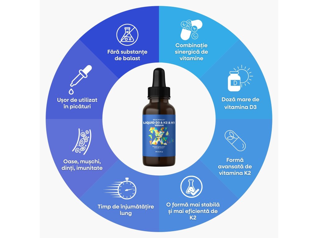 BrainMax KIDS Vegan Liquid D3 & K2 & K1 îmbină vitaminele esențiale pentru dezvoltarea zilnică a copilului. D3 din pin, K2 sub formă de MK-7 în forma patentată K2Vital®Delta și K1 într-un raport perfect echilibrat și 100% formă vegetală. Dozare simplă și minimalistă, calitate și puritate maximă a produsului, datorită bazei de ulei MCT din cocos, care ajută la absorbția acestor vitamine. O singură picătură pe zi aduce calitate și siguranța că organismul copilului primește exact ceea ce are nevoie.