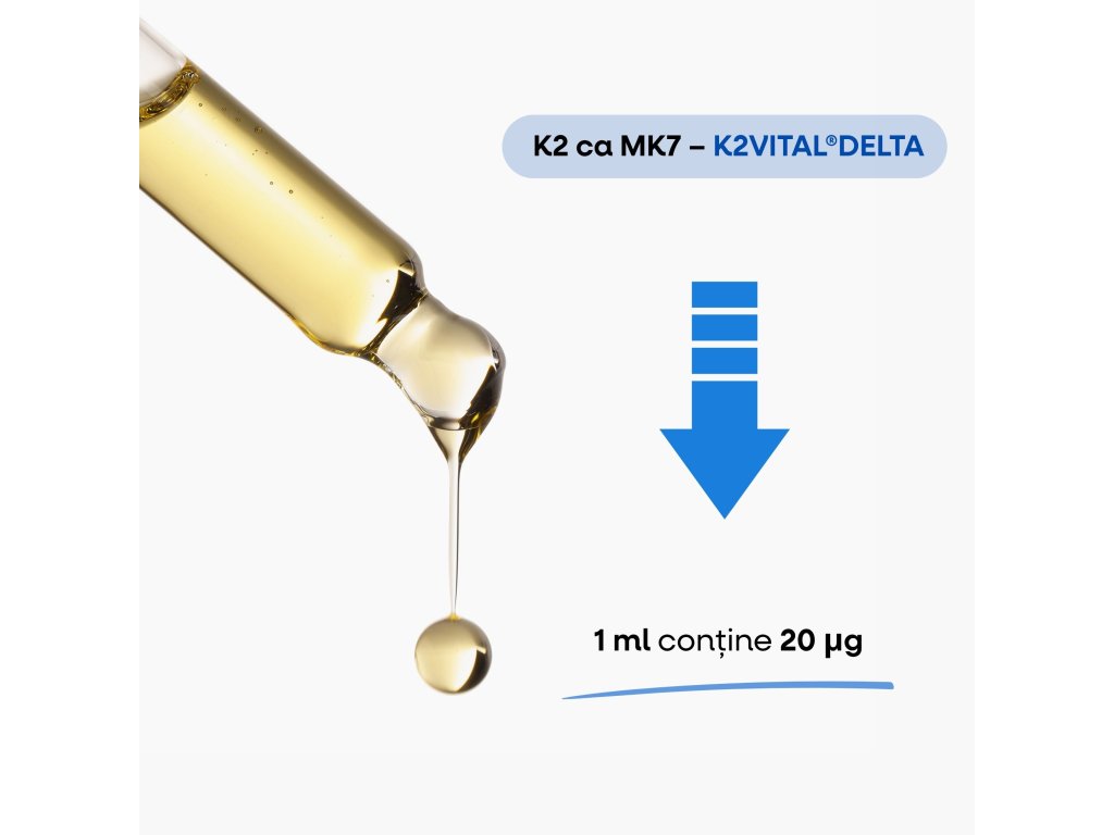 Compoziție per doză (1 picătură): Vitamina D3 (din fitosteroli de pin) (12,5 µg / 500 UI, VNR* 250%), Vitamina K1 (100 µg, VNR* 133,3%), Vitamina K2 (MK-7, K2 VITAL®DELTA) (20 µg, VNR* 26,7%), ulei purtător: ulei BIO MCT. Fără substanțe balastice.