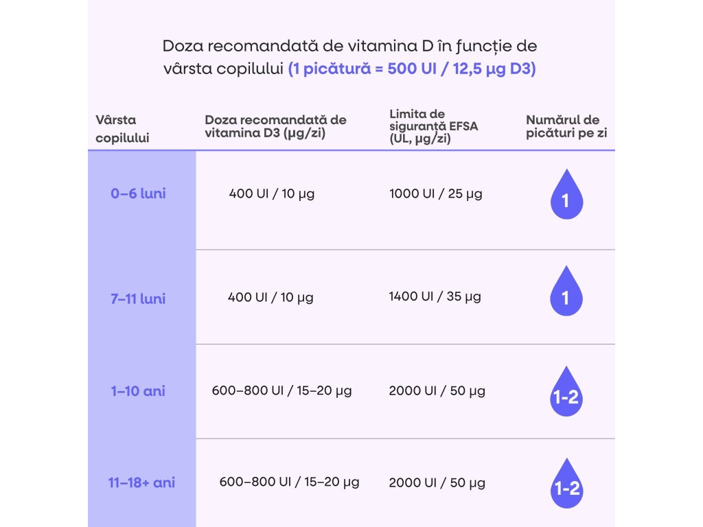 De ce nu sunt suficiente doar D3 și K2? Vitamina K1 joacă un rol important în susținerea coagulării normale a sângelui, adică un proces natural esențial încă din copilăria timpurie. Este o componentă obișnuită a alimentației nou-născuților și copiilor, iar prezența sa ajută la asigurarea faptului că organismul funcționează în echilibru. Tocmai de aceea am adăugat vitamina K1 la vitaminele D3 și K2, pentru ca produsul să fie complet și să susțină nevoile fiziologice naturale ale corpului copilului.