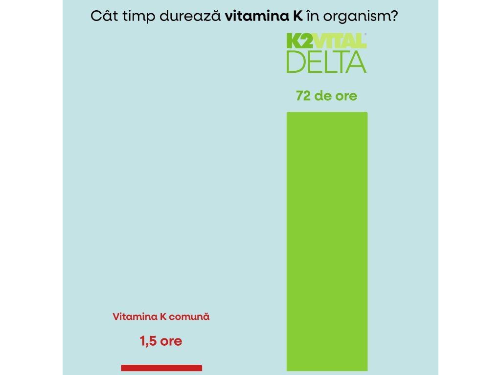 Vitamina K2 sub formă de MK-7 all-trans este mai stabilă decât formele obișnuite de vitamină K și rămâne în organism considerabil mai mult timp – până la 72 de ore, comparativ cu 1,5 ore la alte forme. Datorită acestui fapt, este ideală pentru administrare zilnică unică. Forma brevetată K2VITAL®DELTA este, de asemenea, protejată prin dublă încapsulare, care asigură stabilitatea sa atât în timpul producției, cât și în mediul tractului digestiv.