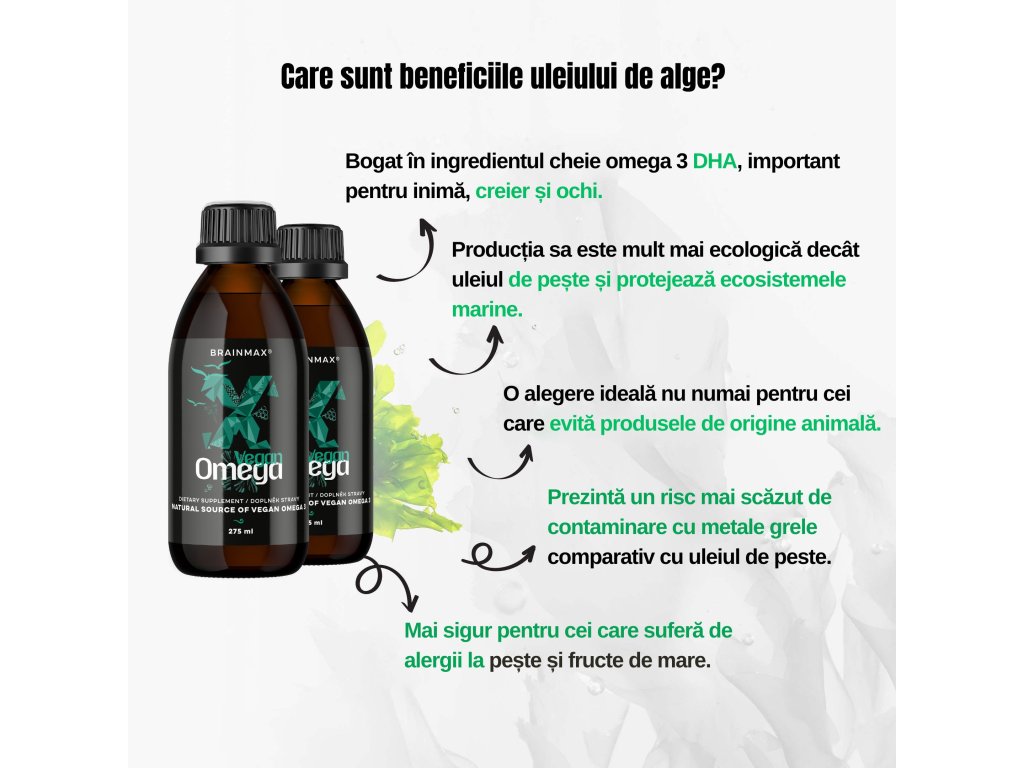 Uitați de semințele de cânepă și alte surse vegetale, din care este foarte dificil să obțineți DHA, un nutrient esențial pentru menținerea funcției normale a ochilor și a creierului. Acum există ALGE, ulei de alge cultivat într- un ecosistem închis, deci nu conține metale grele și toxine. Puteți fi siguri că toate ingredientele din produs sunt de origine vegetală, lipsite de contaminanți, toxine, dar bogate în acizi grași omega-3 ușor absorbabili. Deși putem obține acid alfa-linolenic (ALA) din semințe de chia sau nuci, conversia ALA în EPA (acid eicosapentaenoic) este de maximum 9%, iar DHA ( acid docosahexaenoic) este chiar sub 1% ! De aceea este mai bine să alegem alge marine. Acestea formează baza esențială a lanțului trofic. Și tocmai algele pe care le consumă peștii sunt cele care le fac bogate în omega 3.În același timp, sunt o sursă naturală și sustenabilă de acizi grași omega 3. Nu numai că conțin cantități mari de DHA și EPA, dar datorită fosfolipidelor naturale pe care le conțin, acizii grași sunt ușor de absorbit. În plus, algele sunt purtătoare de clorofilă, substanțe care contribuie la formarea hemoglobinei.