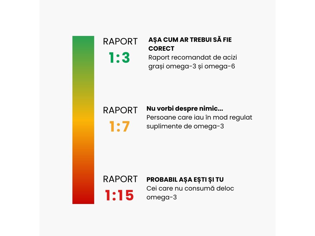 Pentru ca membranele celulelor noastre să funcționeze corect. Aceasta înseamnă permiterea pătrunderii nutrienților și eliberarea produselor reziduale, membranele acestora trebuie să fie permeabile. Prin urmare, raportul celular dintre omega 3 și 6 ar trebui să fie, de preferință, sub 1:5, optim 1:3, dar standardul european este, din păcate, de 1:15. Uleiul de pește a intrat în atenția oamenilor de știință datorită eschimoșilor, care aveau o cantitate mare de acizi grași EPA și DHA în dieta lor și, în același timp, nu sufereau de niciuna dintre bolile obișnuite ale civilizației, cum ar fi accidentul vascular cerebral, infarctul miocardic sau diabetul de tip 2. Cu toate acestea, problema de astăzi este aportul excesiv de OMEGA 6 , iar acest lucru trebuie compensat printr-o doză mai mare de omega 3. Așadar, dacă mâncați, de exemplu, un pachet de chipsuri cu 30 g de omega 6, ar trebui să luați cu el 10 g de acizi grași omega 3.