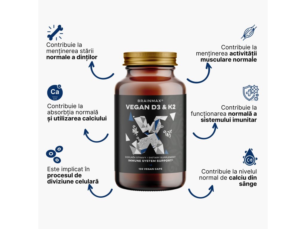 BrainMax Vitamina D3 și K2 combină vitaminele D3 și K2, doi micronutrienți care au fost cercetați pe larg pentru rolul lor în sănătatea oaselor, dentară și imunitară. Vitamina D3contribuie la absorbția normală a calciului, iar vitamina K2 contribuie la menținerea unei stări osoase normale și este implicată în buna funcționare a coagulării sângelui. Vitamina D3 este 100% pe bază de plante și potrivită pentru vegani.
