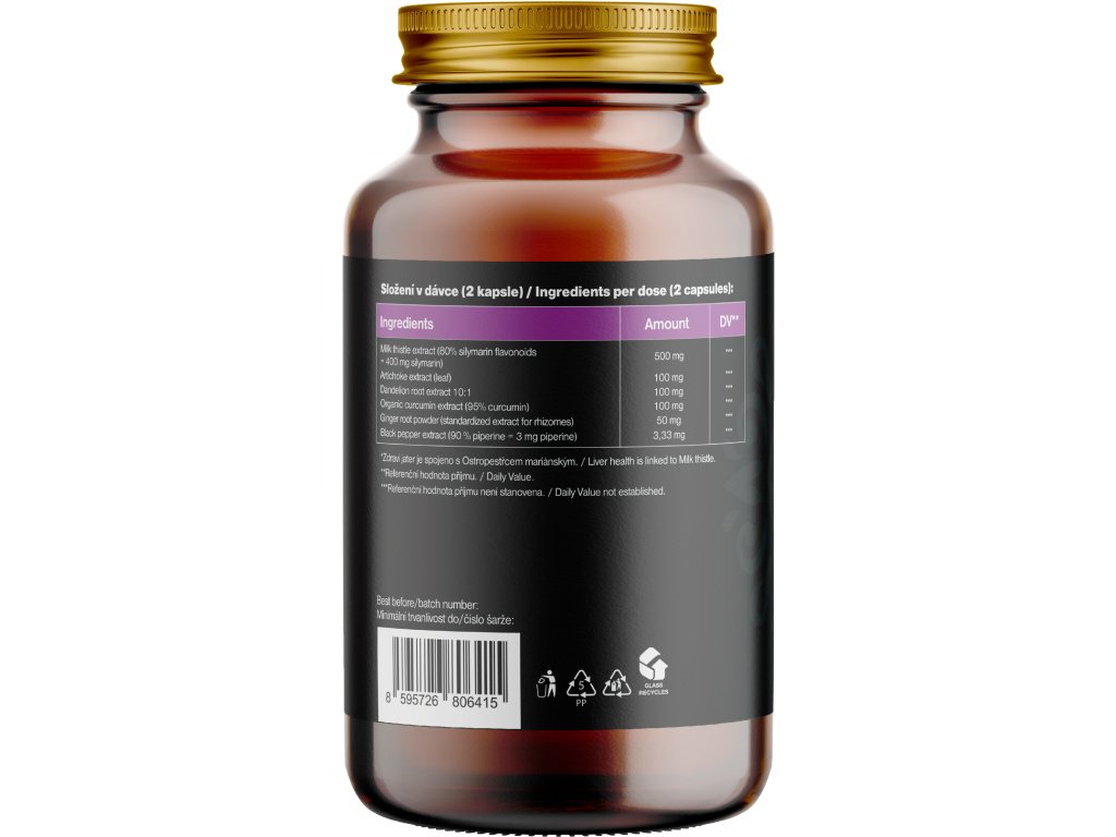 Compoziție: Extract de armurariu (80% flavonoide silymarinice = 400 mg silymarin), extract de anghinare (frunze), extract de rădăcină de păpădie 10:1, extract de turmeric BIO (95% curcumin), pulbere de rădăcină de ghimbir (extract standardizat din rizom), extract de piper negru (90% piperină = 3 mg piperină), oxid de siliciu. Capsulă vegetală pe bază de HPMC.