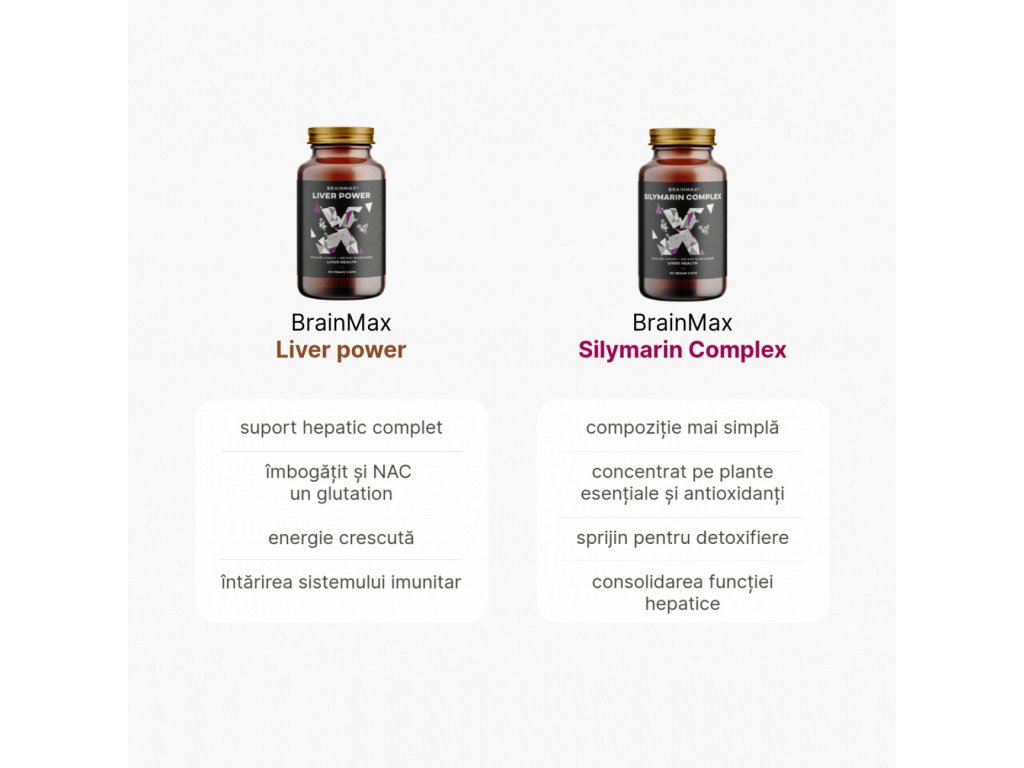 BrainMax Silymarin, care oferă o combinație unică de extracte din plante cunoscute pentru influența lor pozitivă asupra ficatului. Componenta principală a complexului nostru este extractul de armurariu cu un conținut de 80% silimarină. Flavolignanii silibinina, silidianina și silichristina, care formează silimarina, au proprietăți antioxidante puternice și susțin funcționarea normală a ficatului, dar și digestia.