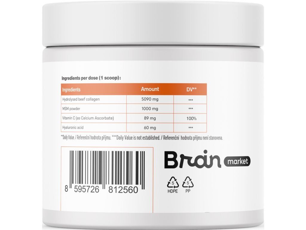 Compoziție: Colagen hidrolizat (5090 mg), MSM pulbere (1000 mg), 1Vitamina C (89 mg, VNR 100 %) ca ascorbat de calciu, Acid hialuronic (60 mg), regulator de aciditate: acid citric, îndulcitor: glicoizi de steviol, aromă naturală, colorant: betacaroten. Nu conține substanțe balast.