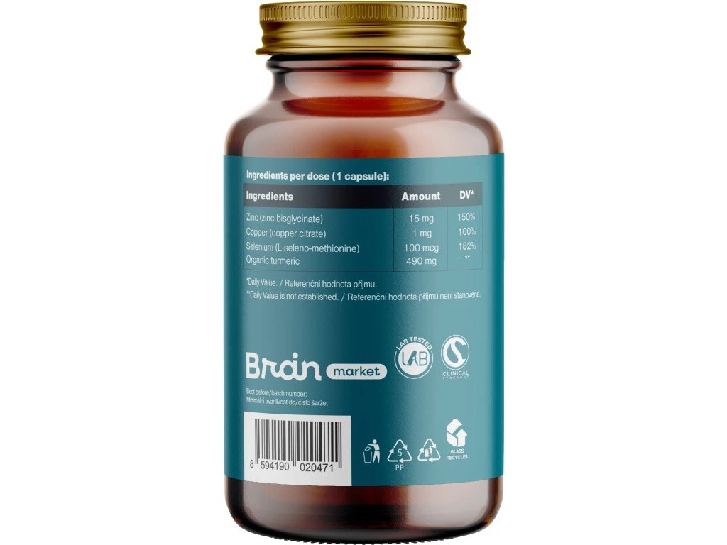 Ingrediente: bisglicinat de zinc, citrat de cupru, L-selenometionină, turmeric organic. Capsulă vegetală pe bază de HPMC. Nu conține substanțe de balast (E-uri).