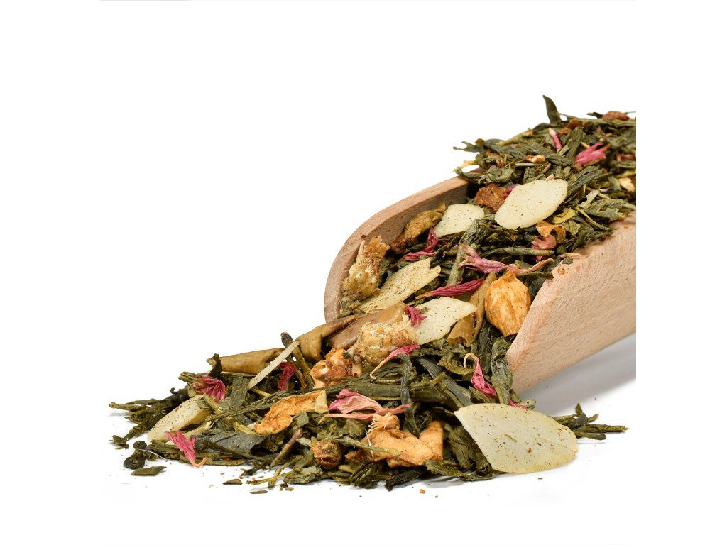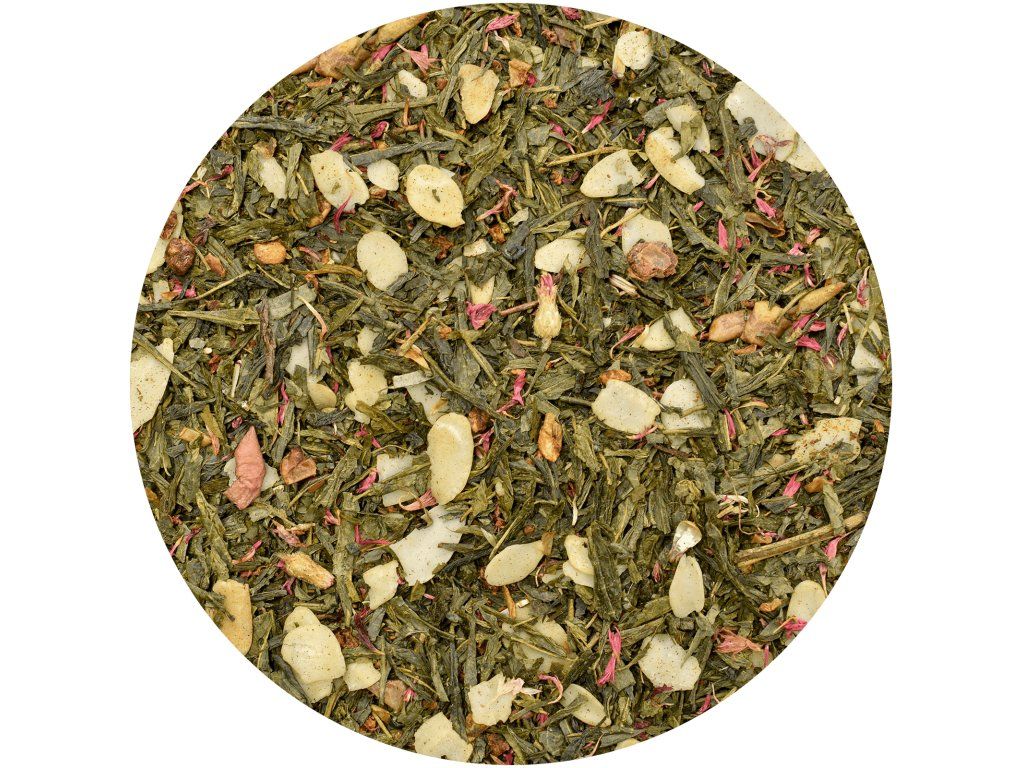 78,7% ceai verde Sencha, 10% mere, fulgi de migdale, scortisoara, petale de floarea de colt, ulei natural, aroma