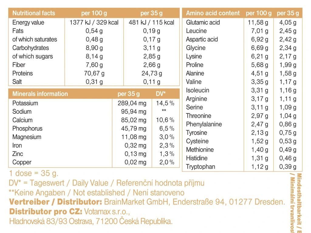 Valori nutriționale la 100 g: Valoare energetică: 1377 kJ / 329 kcal, Grăsimi: 0,54 g (din care acizi grași saturați: 0,48 g), Carbohidrați: 8,90 g (din care zaharuri: 8,14 g), Fibre: 7,60 g, Proteine: 70,67 g, Sare: 0,31 g.