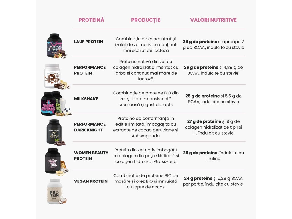Atât LAUF, cât și Performance Protein conțin proteine native de cea mai înaltă calitate. Totuși, diferența este că LAUF conține 100% proteină nativă sub formă de izolat și concentrat într-un raport de 1:1. În timp ce Performance conține 62% proteină nativă din zer și 26% colagen provenit de la vaci hrănite cu iarbă. De asemenea, este îmbogățit cu colostru de vacă și lapte de cocos. Proteina LAUF conține un spectru mai bogat de aminoacizi, în special leucină pro-anabolică, deoarece conține 100% proteină nativă din zer. Proteina LAUF este mai concentrată pe suplimentarea cu proteine nu doar pentru performanța atletică și creșterea masei musculare, în timp ce Performance are utilizări mai largi pentru imunitate, intestine, dar și antrenament.